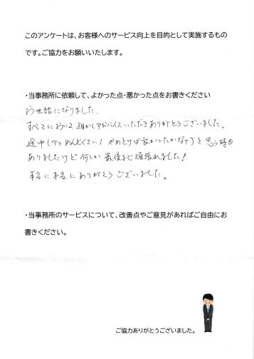 お子様が3人いらっしゃるので必要書類を集めるのに苦労なされた様子でしたが、遺産分割協議書を当事務所で作成し、登記を提携する司法書士事務所に依頼し、無事に終えることができました。最後は、「肩の荷が下りてスッキリしました」と喜んでみえたのが印象的でした。